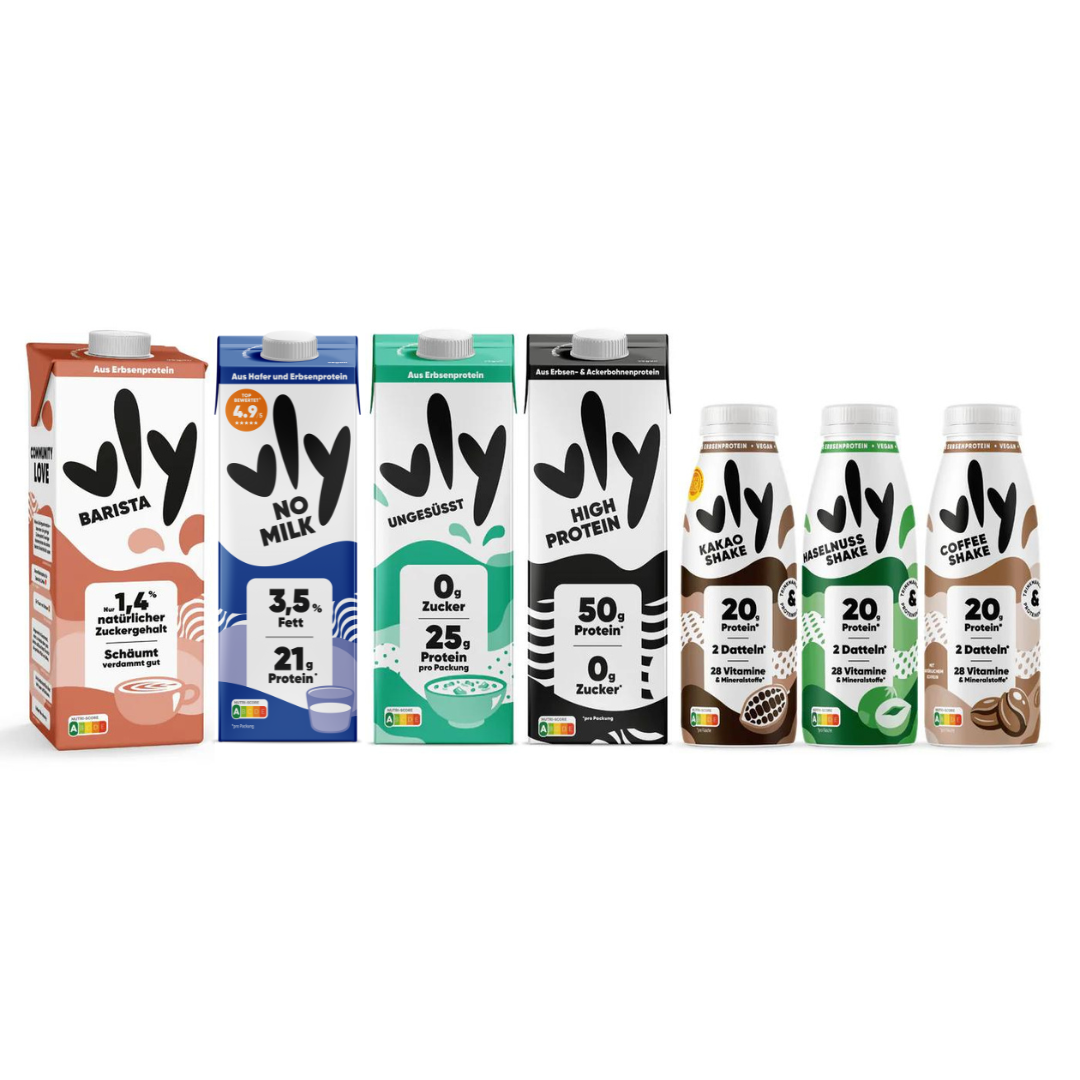 Das All-vly Bundle enthält 4 x 1 L Milchalternativen und 3 x 400 ml Shakes (1 x vly Barista, 1 x vly No Milk, 1 x vly Ungesüsst, 1 x vly High Protein, 1 x vly Kakao, 1 x vly Haselnuss, 1 x vly Coffee).