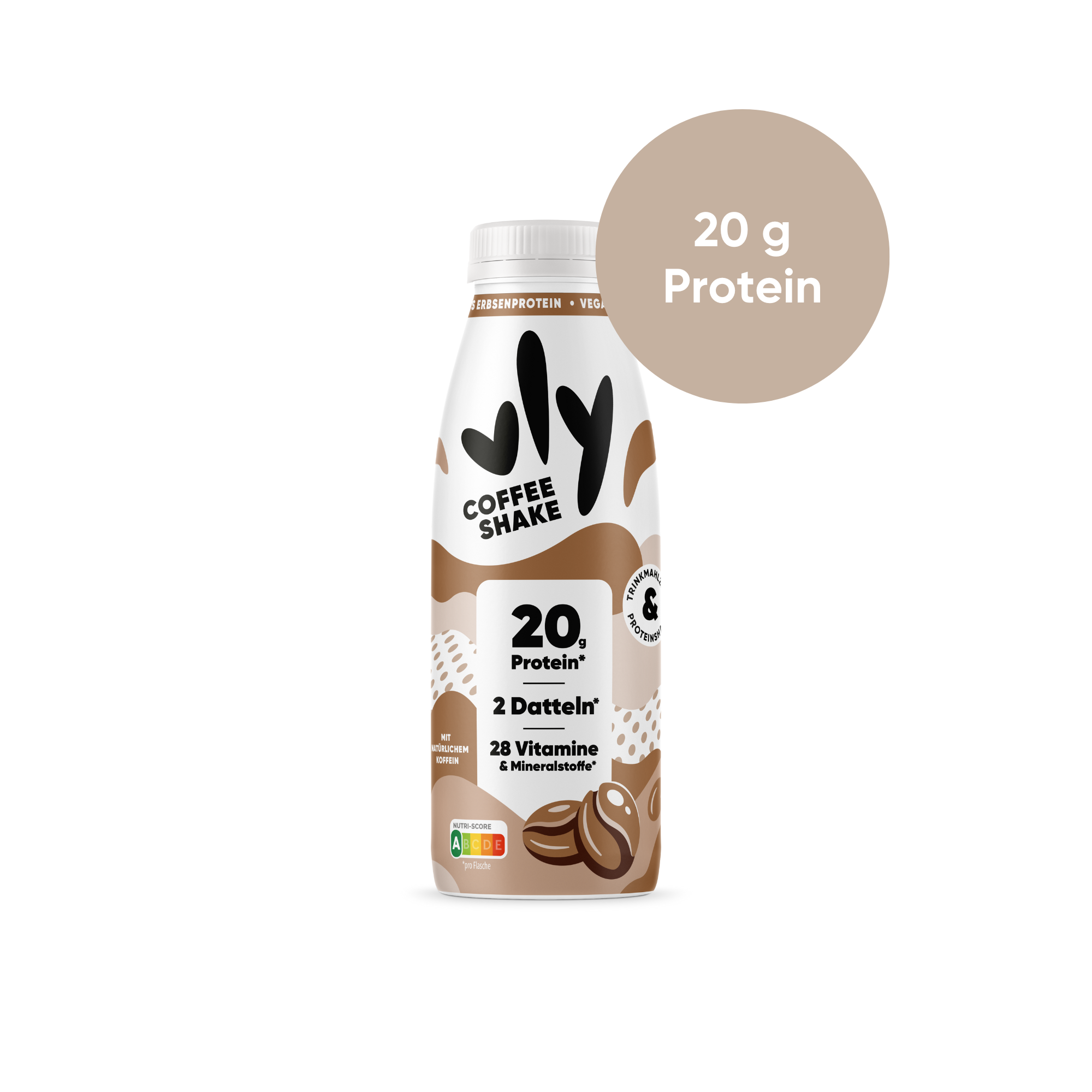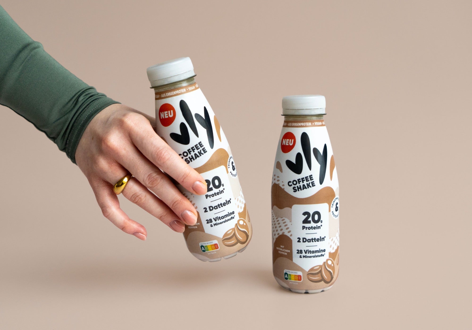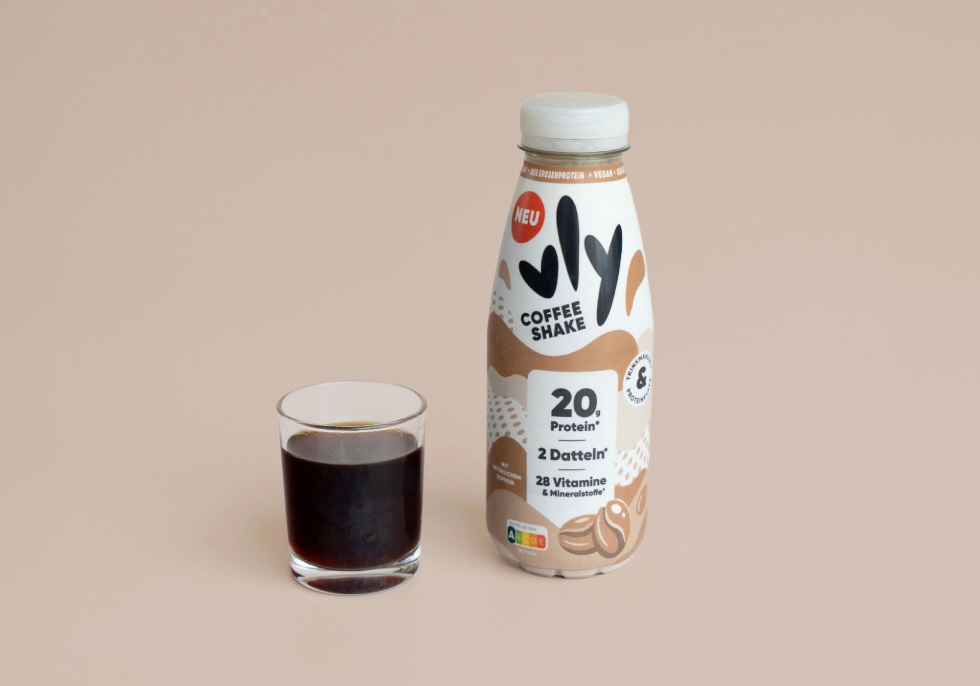 Kaffee-Kick, Protein-Boost und 28 Vitamine & Mineralstoffe - das alles steckt im neuen vly Coffee Shake! Eine Flasche enthält so viel Koffein wie ein Espresso, 20 g Erbsenprotein, die natürliche Süße aus zwei Datteln und 28 hochwertige Vitamine und Mineralstoffe. Als Trinkmahlzeit für zwischendurch oder Proteinshake nach dem Sport – du entscheidest. Jetzt probieren!