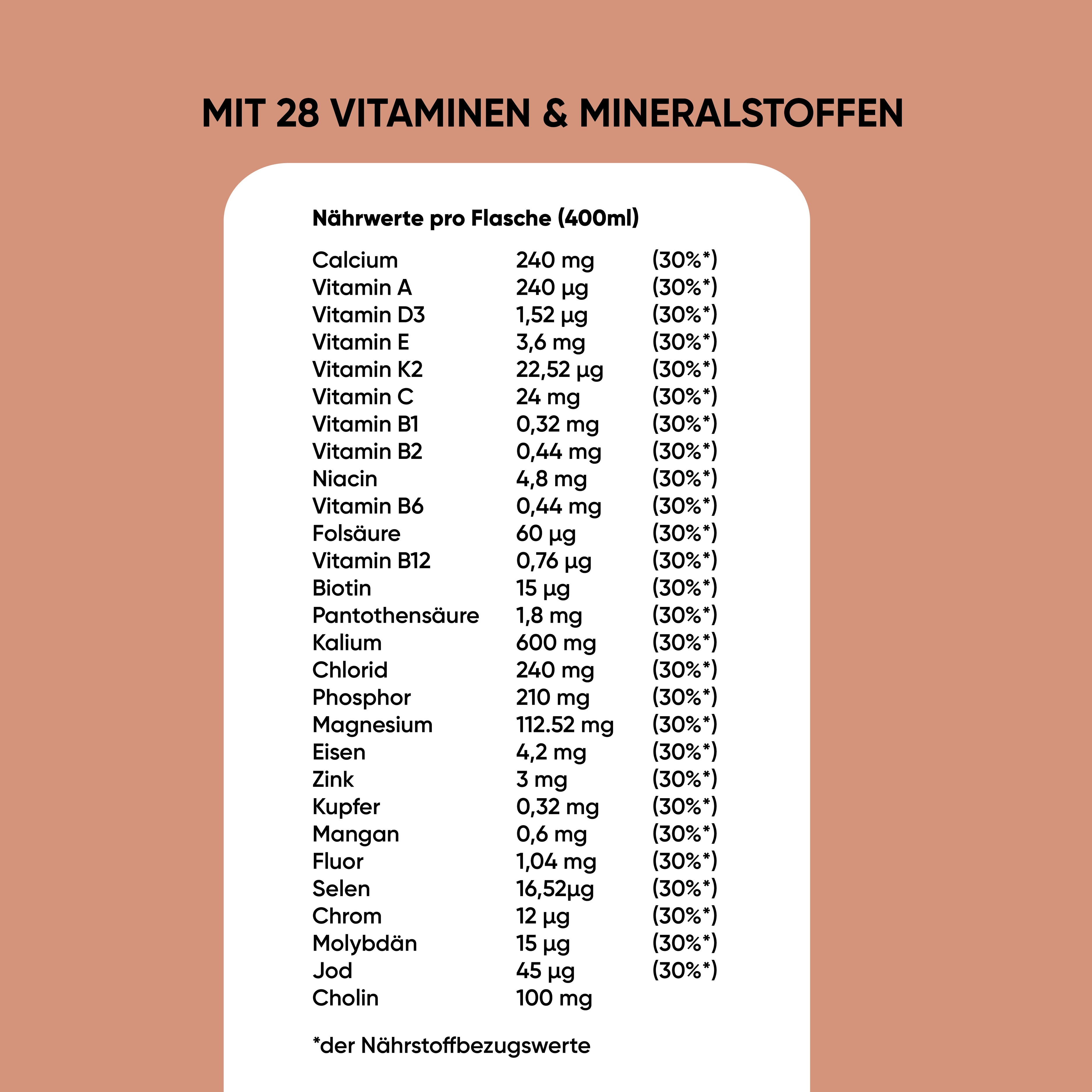 Dieser Kakao ist keine gewöhnliche Trinkschokolade. In einer Flasche stecken nämlich 20 g Erbsenprotein, 28 Vitamine und Mineralstoffe, nachhaltiger Kakao und die natürliche Süße aus Datteln. Die hochwertigen Zutaten und Nährstoffe machen diesen Shake zur ausgewogenen Trinkmahlzeit für zwischendurch oder zum stärkenden Proteinshake nach dem Sport.
