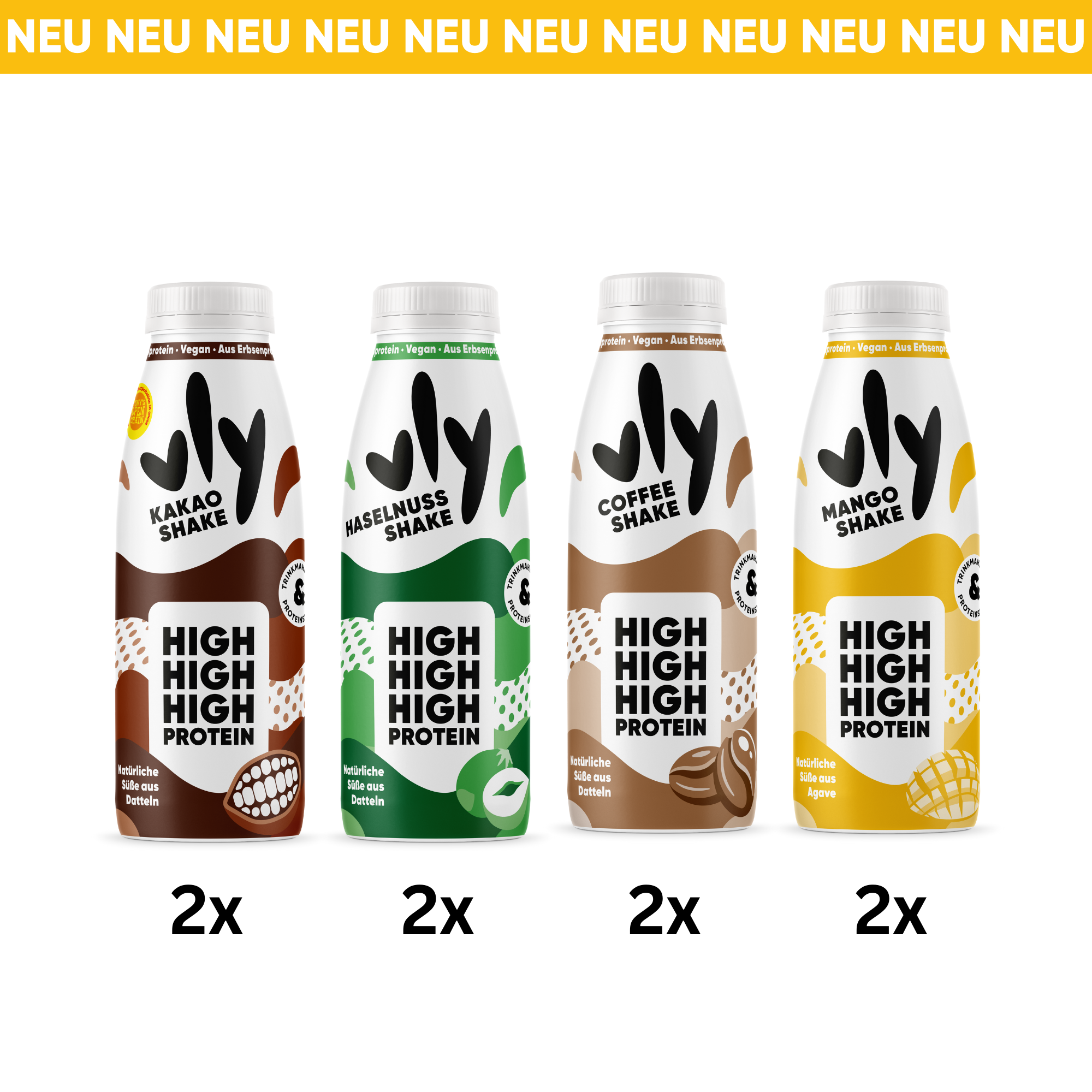 Was du hier siehst, sind keine normalen Shakes. Mit 20 g Protein pro Flasche, der natürlichen Süße von Datteln oder Agave und 28 Vitaminen & Mineralstoffen sind unsere vly Shakes genau die richtige Stärkung. Ob Trinkmahlzeit für Zwischendurch oder als Proteinshake nach dem Sport - du entscheidest. Jetzt alle vier probieren!